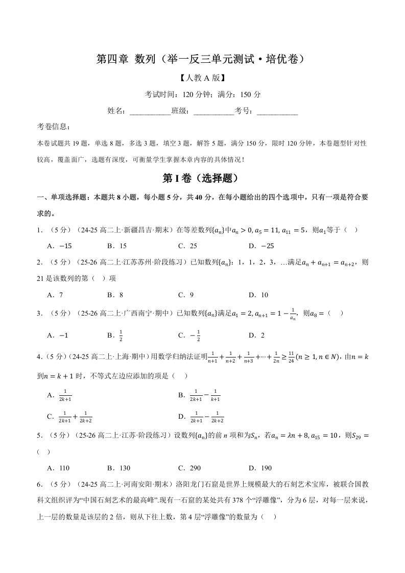 首页 > 全部 > 举一反三 > 第四章 数列(举一反三单元测试·培优卷)(学生版)