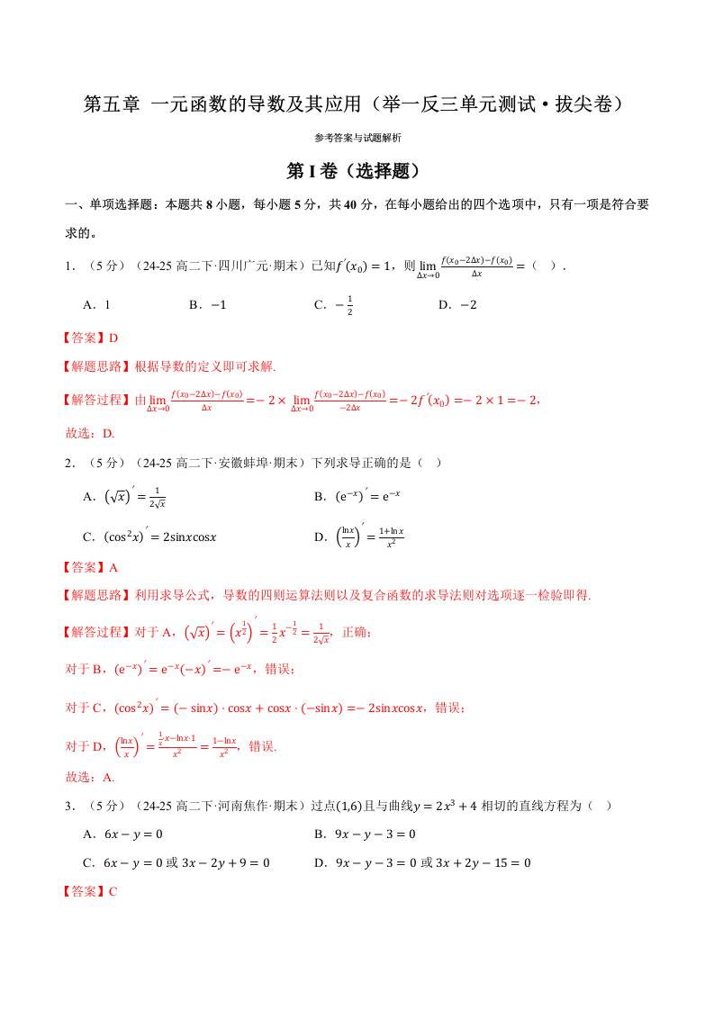 首页 > 全部 > 举一反三 > 第五章 一元函数的导数及其应用(举一反三单元测试·拔尖卷)(教师版)