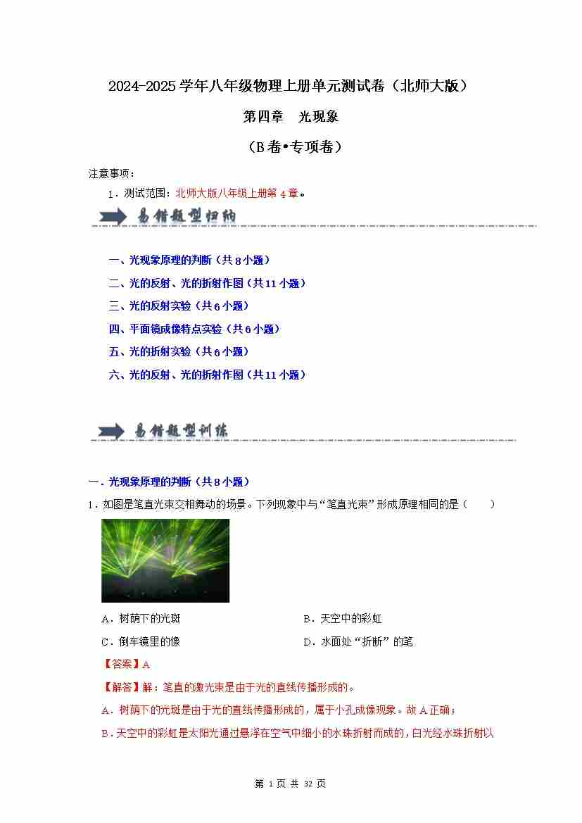 首页 > 全部 > 单元AB卷 > 第4章 光现象【B卷…37题5大考点)(北师大版2024)(解析版)