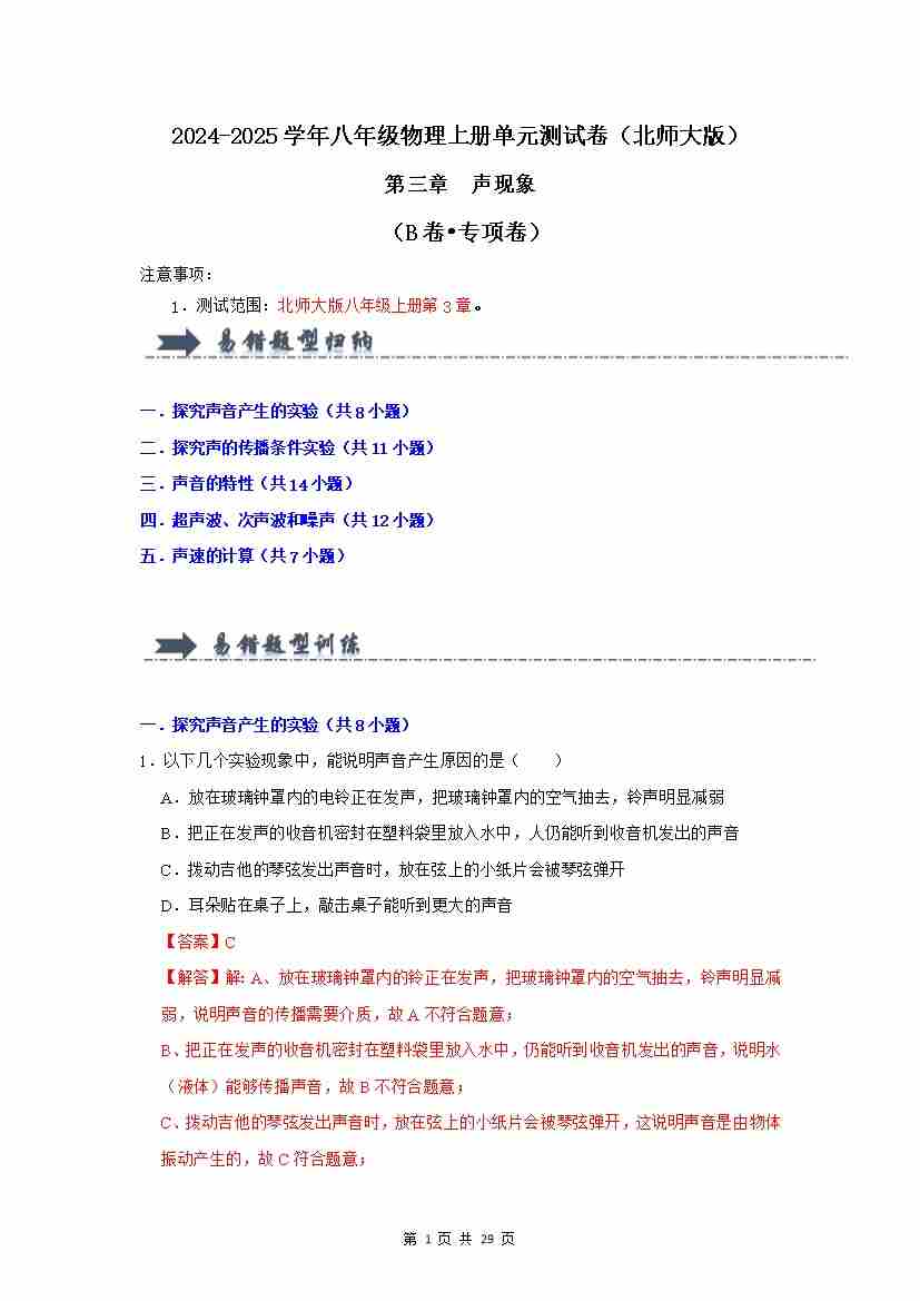 首页 > 全部 > 单元AB卷 > 第3章 声现象【B卷…52题5大考点)(北师大版2024)(解析版)