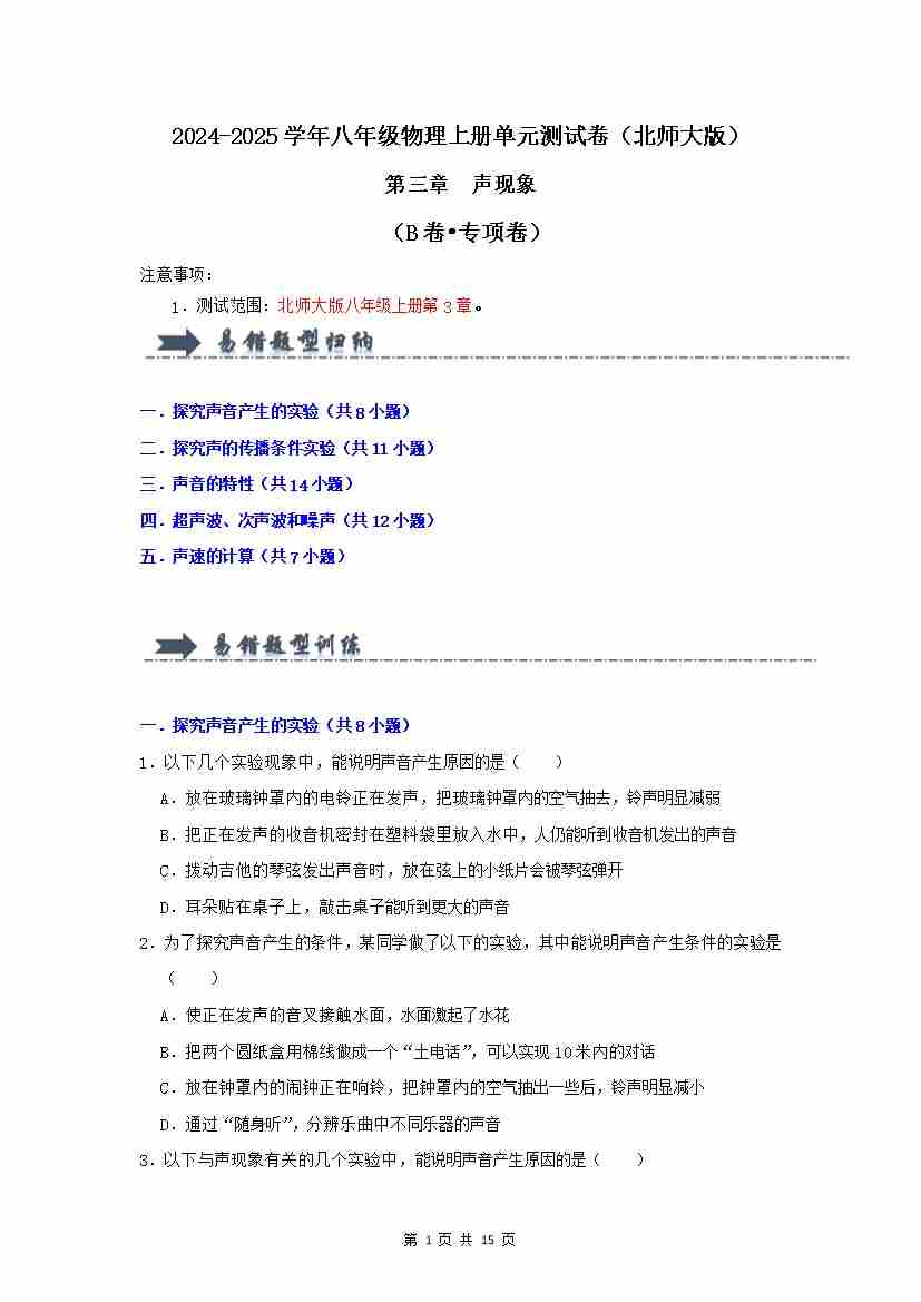 首页 > 全部 > 单元AB卷 > 第3章 声现象【B卷…52题5大考点)(北师大版2024)(原卷版)