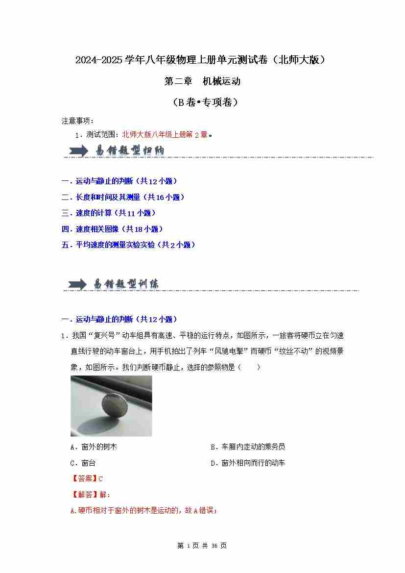首页 > 全部 > 单元AB卷 > 第2章 机械运动【B卷…60题5大考点)(北师大版2024)(解析版)