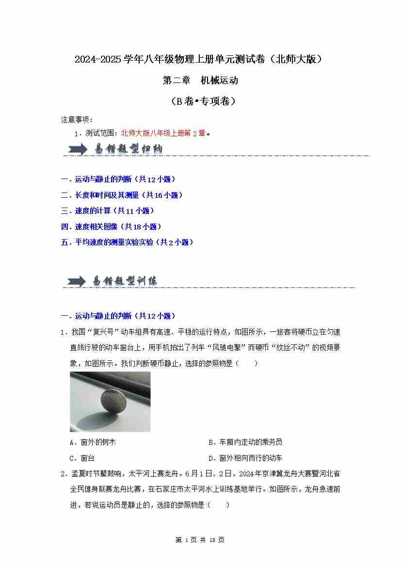 首页 > 全部 > 单元AB卷 > 第2章 机械运动【B卷…60题5大考点)(北师大版2024)(原卷版)