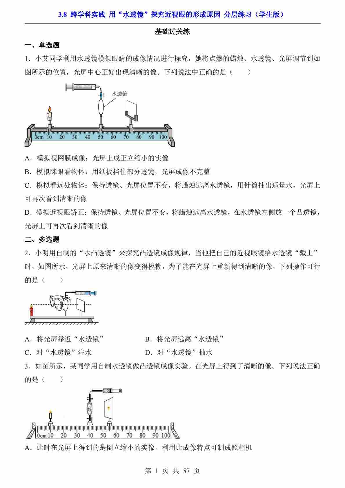 3.8 跨学科实践“用‘水透镜’探究近视眼的形成原因”(分层练习)---沪粤版