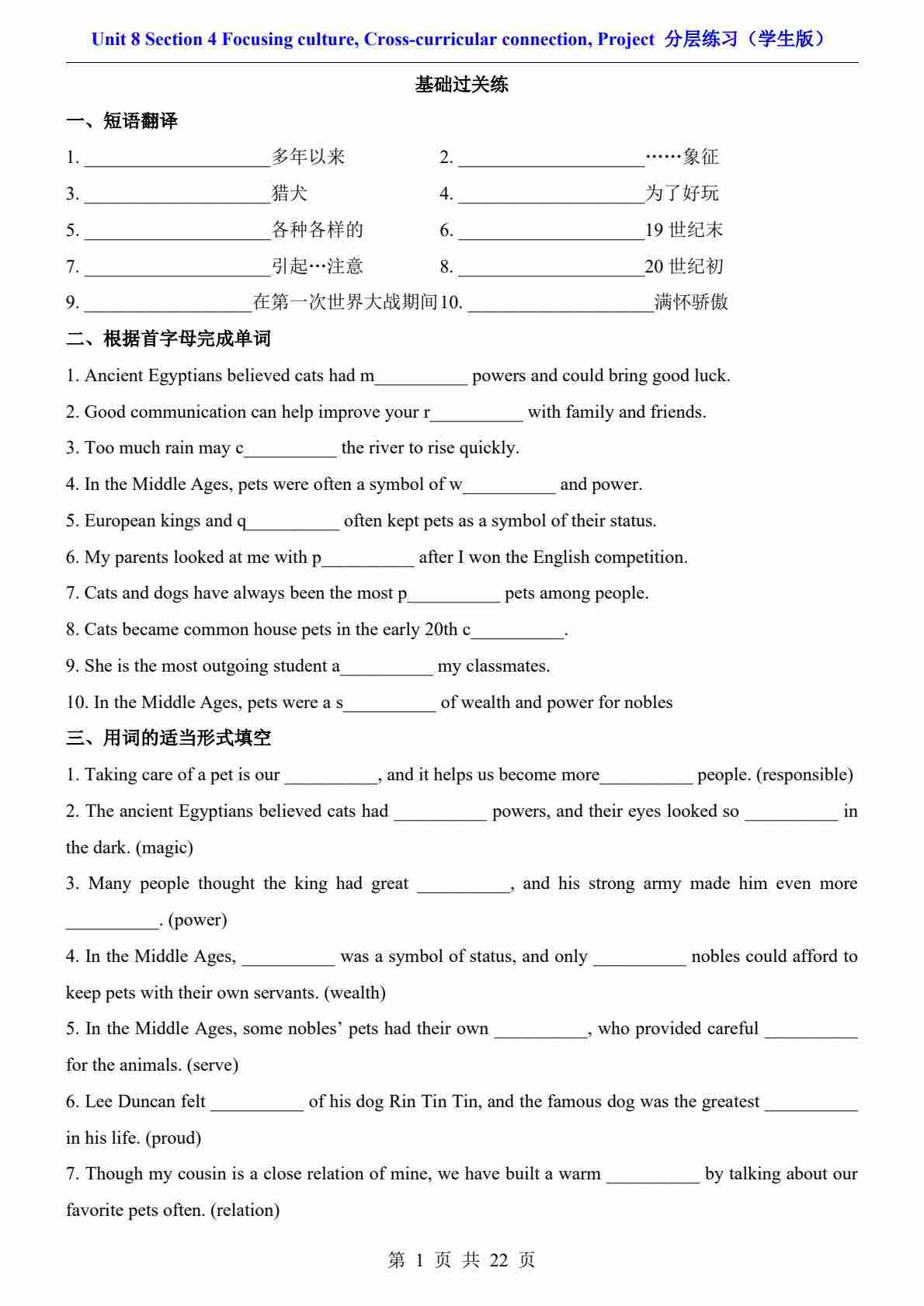 Unit 8 Section 4 Focusing culture, Cross-curricular connection, Project(分层练习)八上沪教