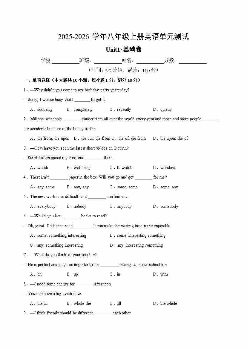首页 > 全部 > 单元检测 > Unit1单元测试·基础卷(考试版A4)