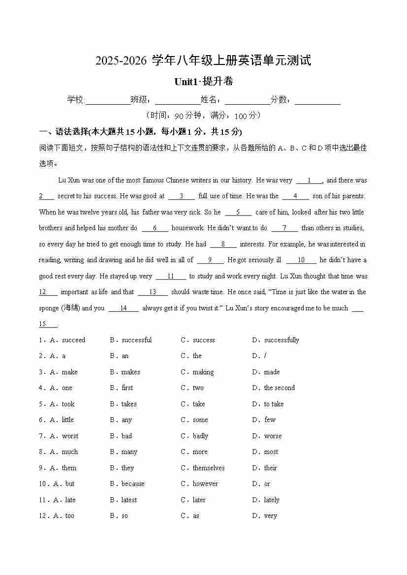 首页 > 全部 > 单元检测 > Unit1单元测试·提升卷(考试版A4)33