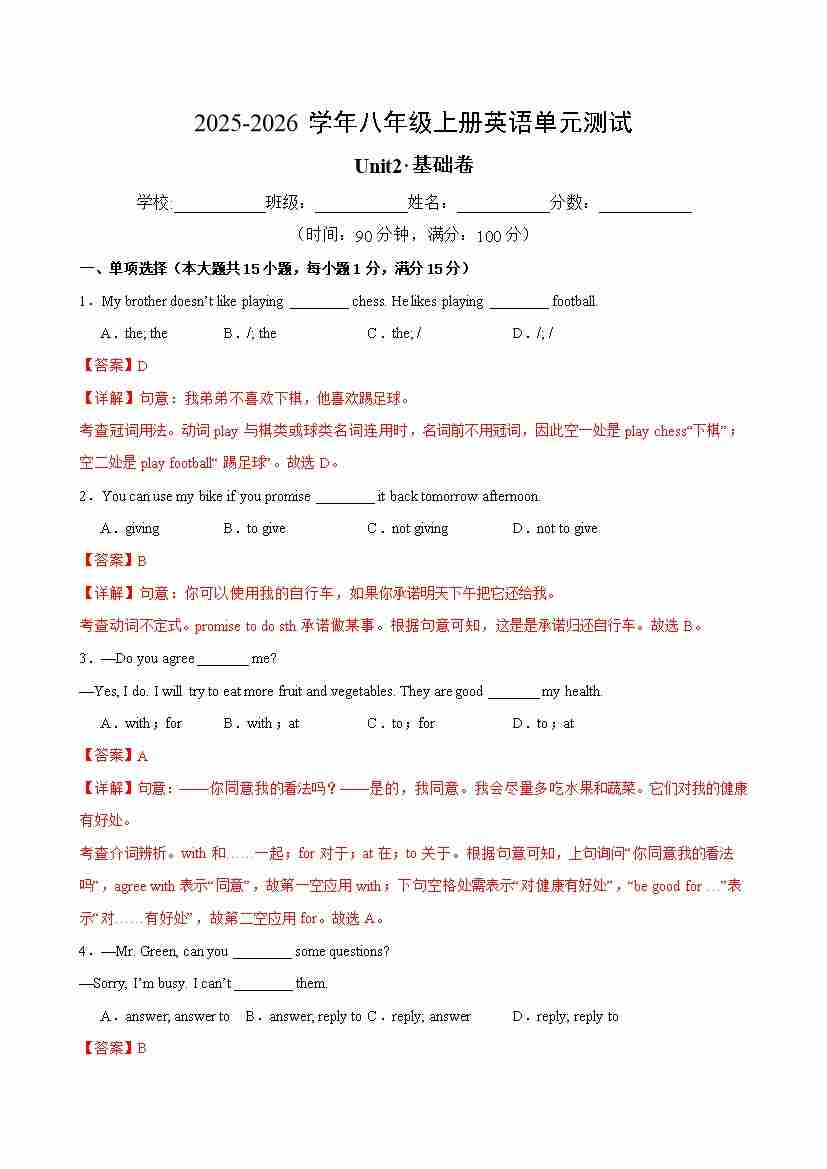 首页 > 全部 > 单元检测 > Unit2单元测试·基础卷(解析版)11