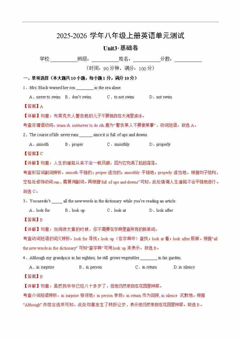 首页 > 全部 > 单元检测 > Unit3单元测试·基础卷(解析版)11
