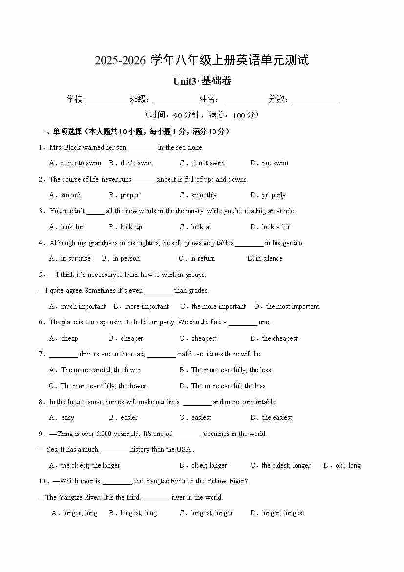 Unit3单元测试·基础卷(考试版A4)22