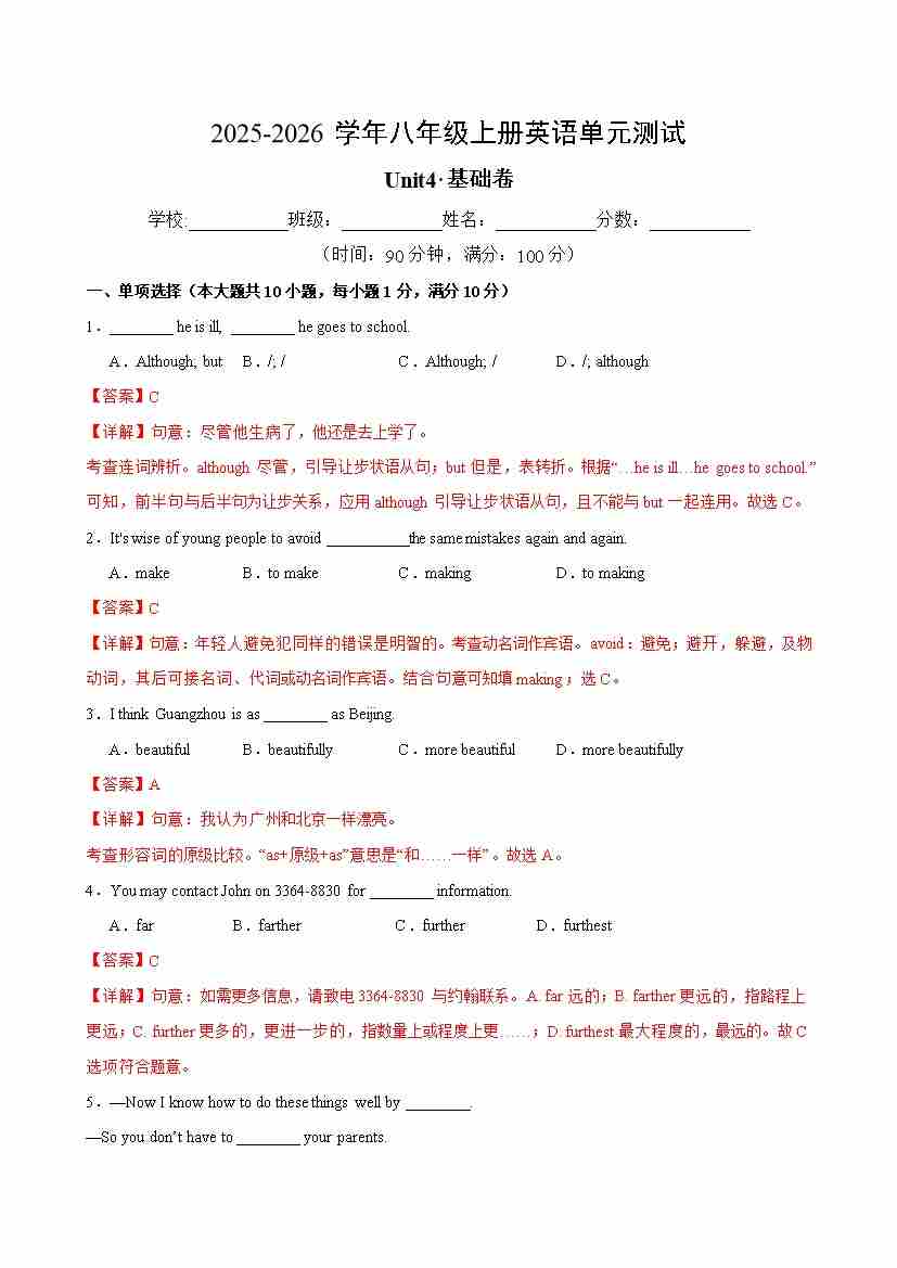 首页 > 全部 > 单元检测 > Unit4单元测试·基础卷(解析版)11