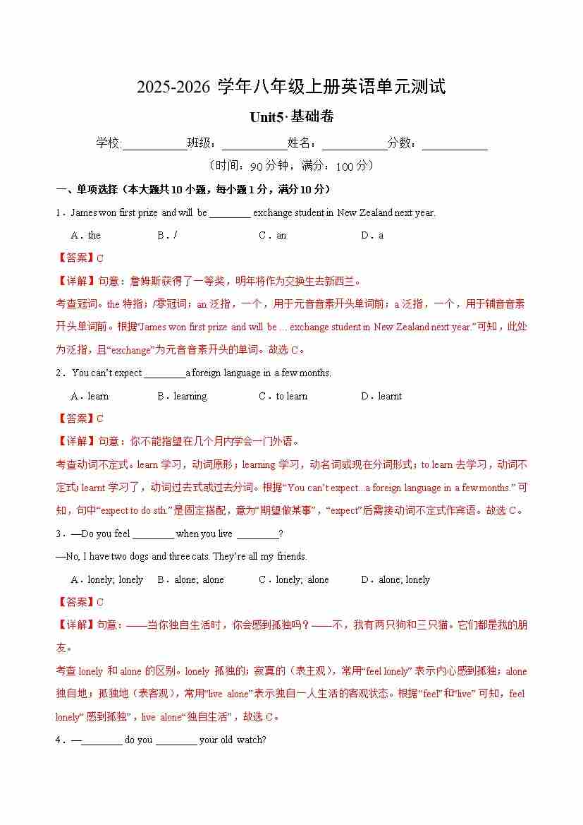 首页 > 全部 > 单元检测 > Unit5单元测试·基础卷(解析版)22