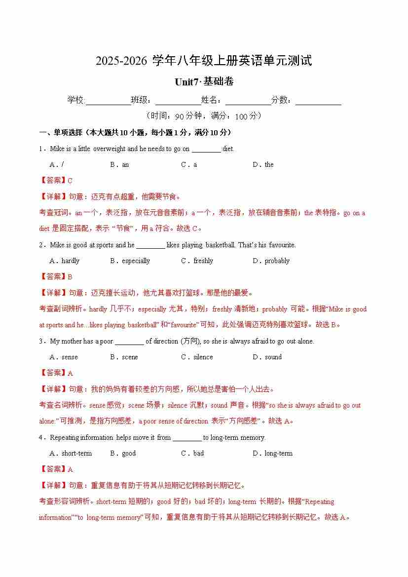 首页 > 全部 > 单元检测 > Unit7单元测试·基础卷(解析版)55