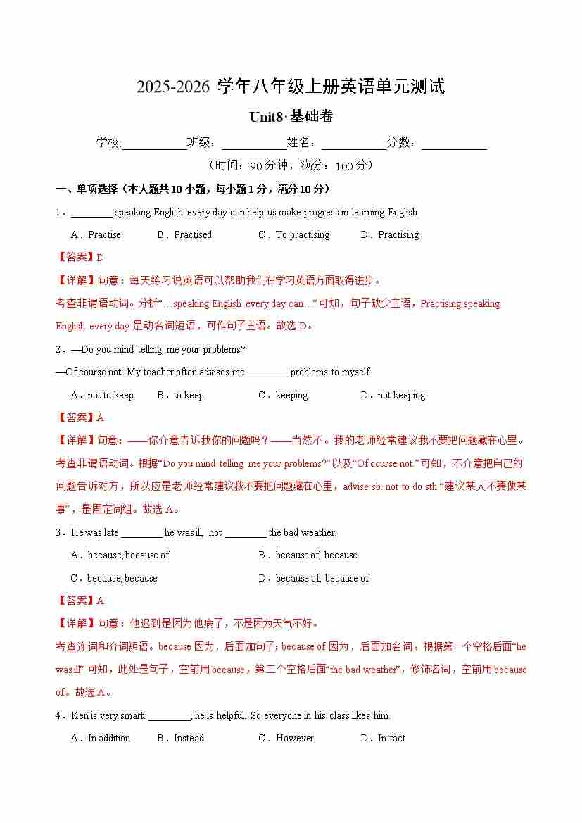 八年级英语上册Unit8单元测试·基础卷(教师版)