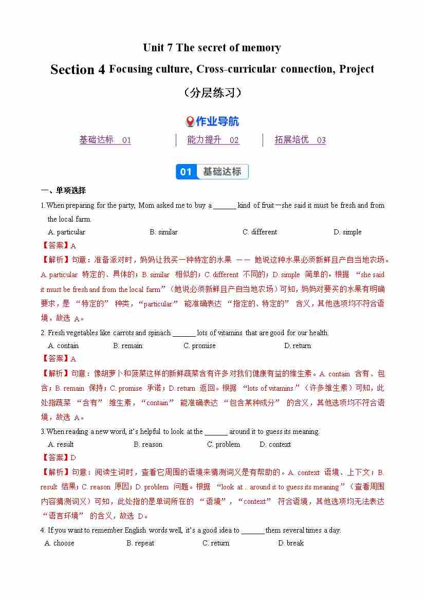 首页 > 全部 > 分层作业 > Unit 7 课时5 Section 4 Focusing culture,Cross-curricular connection,Project(分层作业)(解析版)