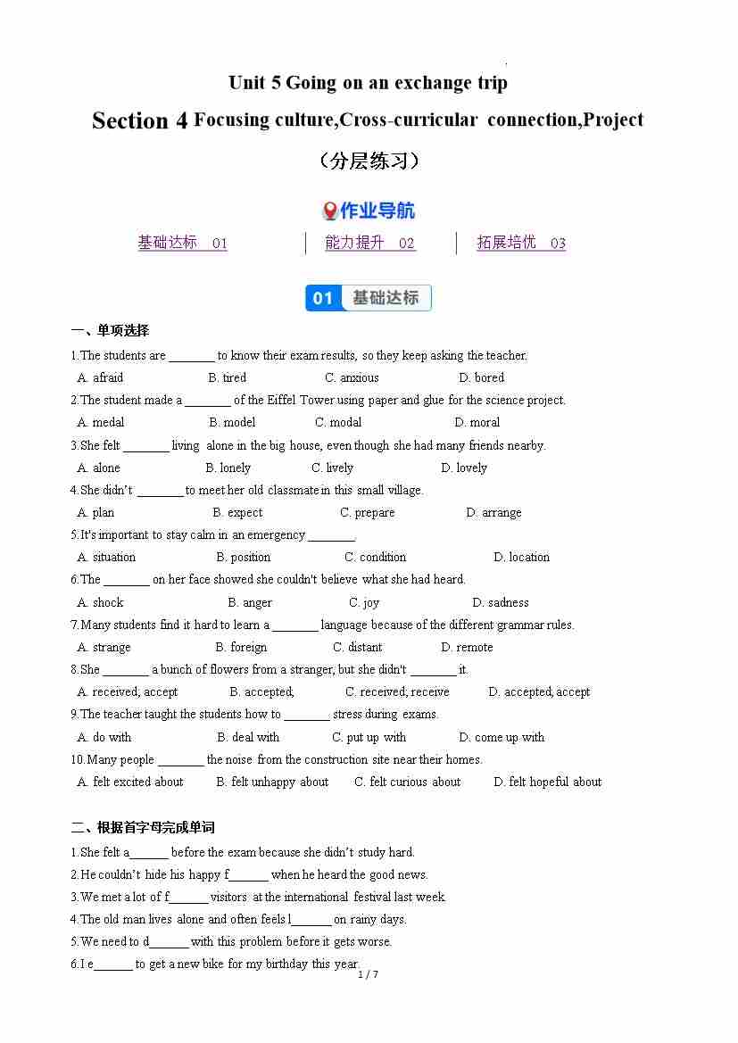 Unit 5 课时5 Section 4 Focusing culture,Cross-curricular connection,Project(分层作业)(原卷版)八上沪教