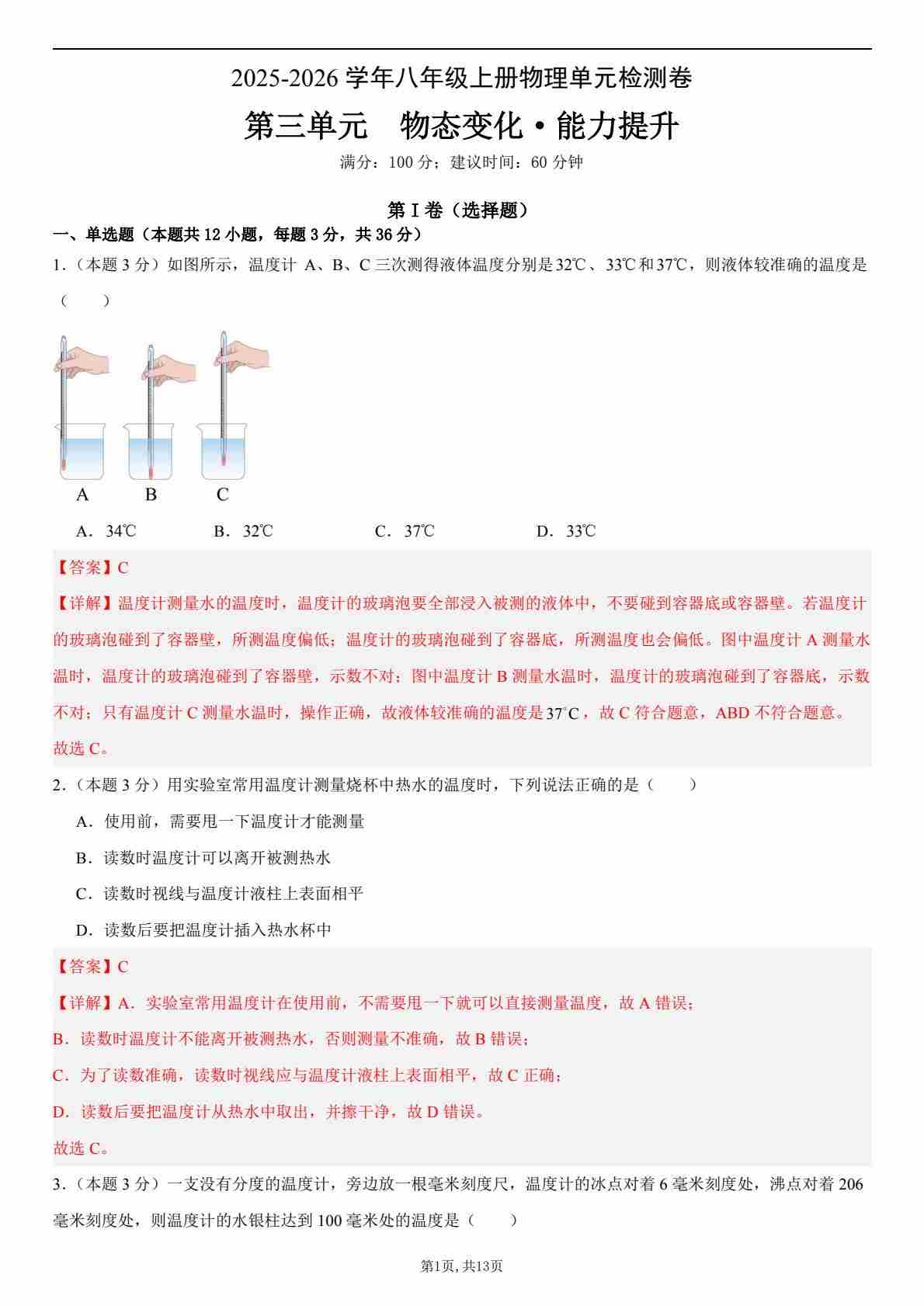 首页 > 全部 > 单元提升卷 > 【八上人教物理】第三单元 物态变化(单元测试·提升卷)(解析版)1