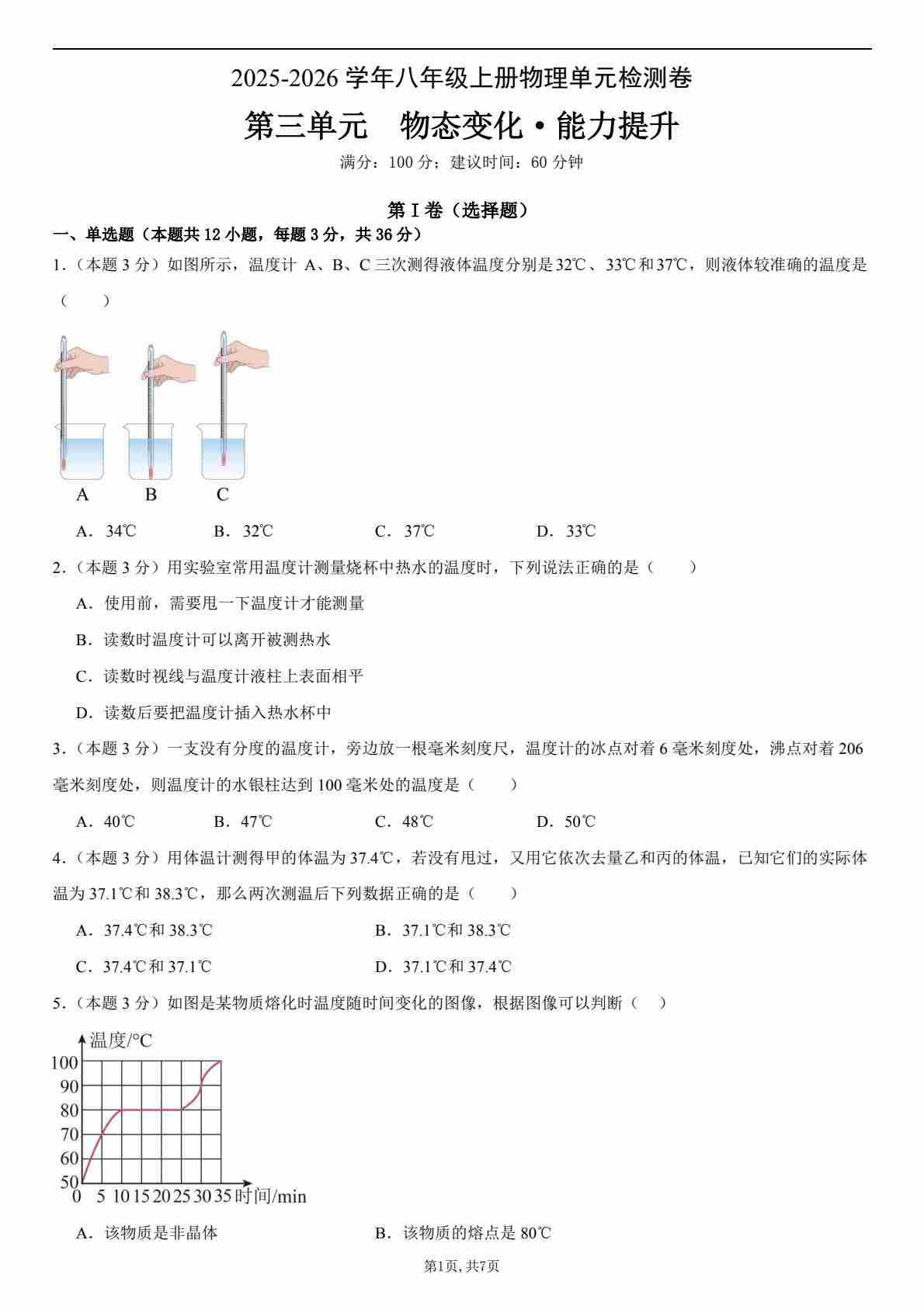 首页 > 全部 > 单元提升卷 > 【八上人教物理】第三单元 物态变化(单元测试·提升卷)(考试版A4)