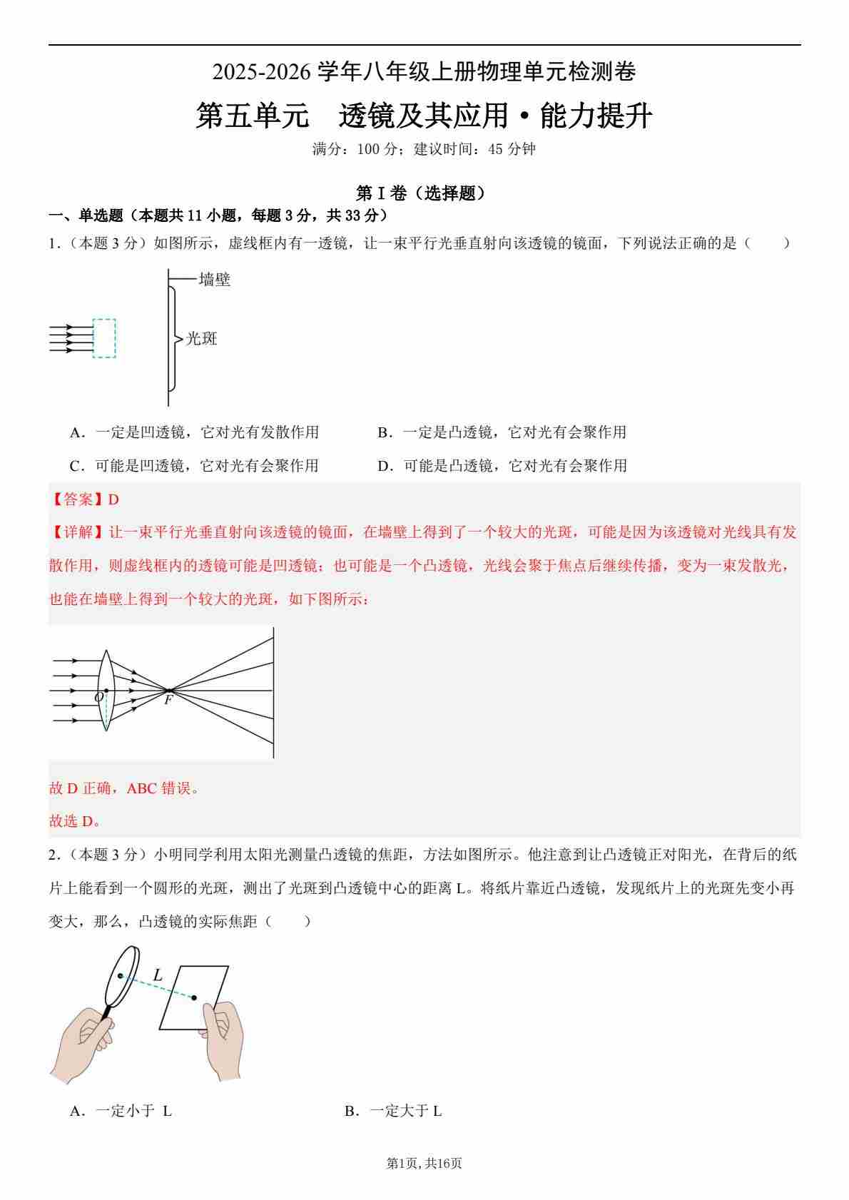首页 > 全部 > 单元提升卷 > 【八上人教物理】第五单元 透镜及其应用(单元测试·提升卷)(解析版)1