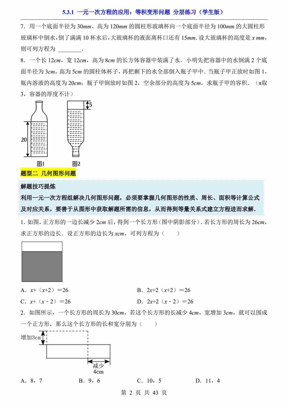 首页 > 全部 > 一课一练 > 5.3.1 一元一次方程的应用:等积变形问题(分层练习)