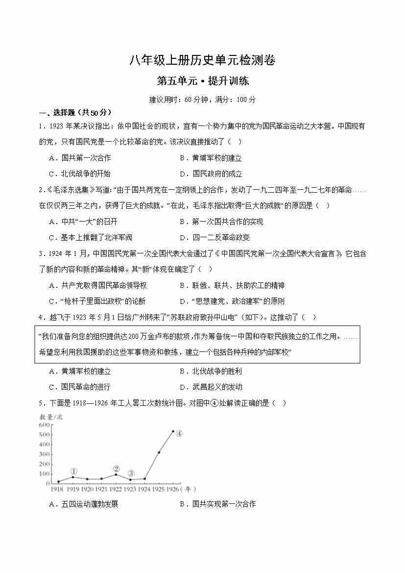 八上历史第五单元测试·提升卷(解析版)