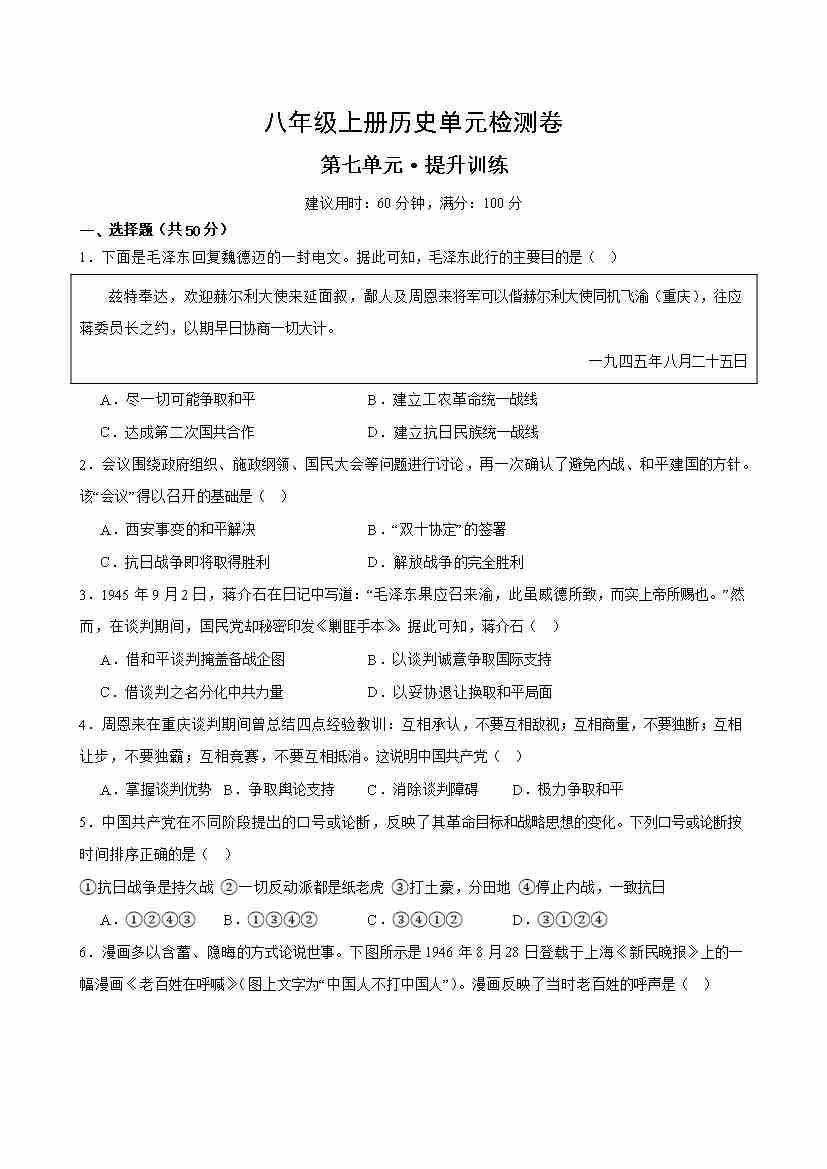 首页 > 全部 > 单元提升卷 > 八上历史第七单元测试·提升卷(考试版A4)