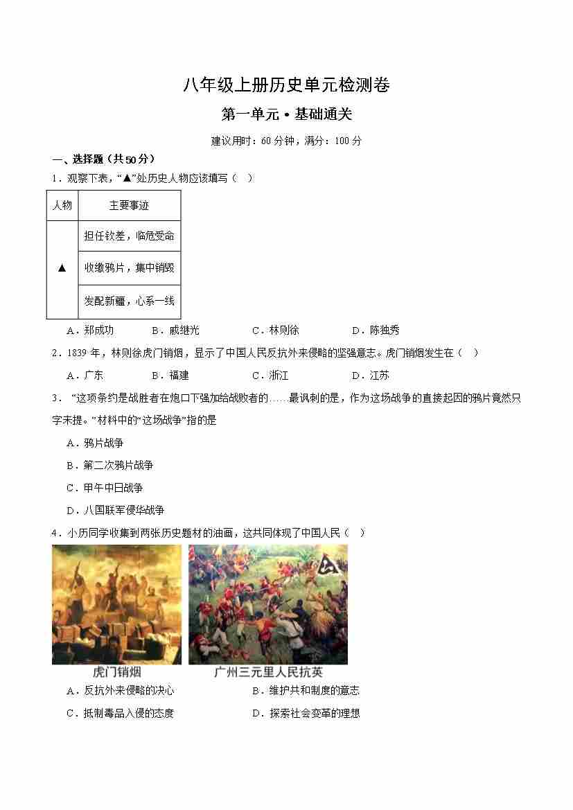 八上历史第一单元测试·基础卷(考试版A4)