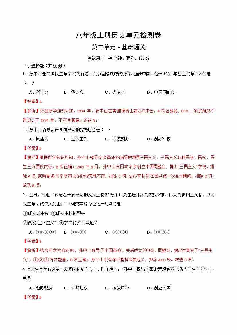 八上历史第三单元测试·基础卷(解析版)