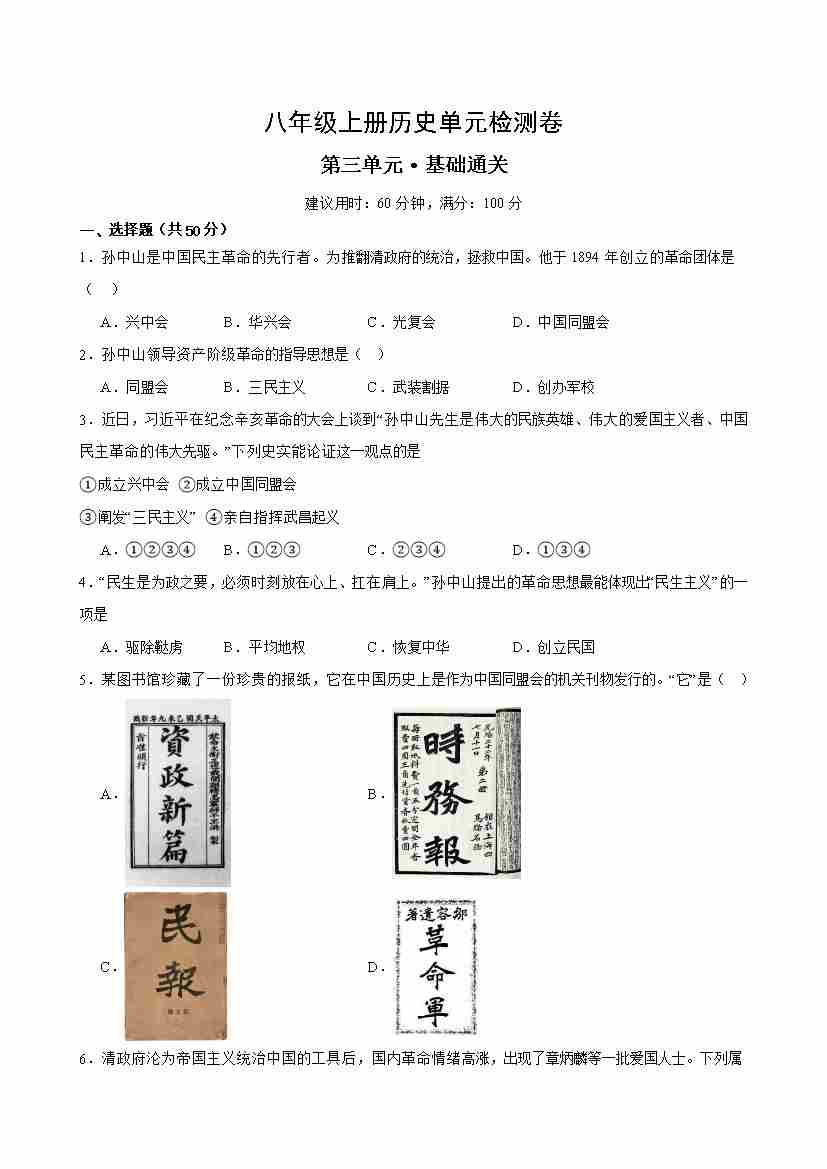 八上历史第三单元测试·基础卷(考试版A4)