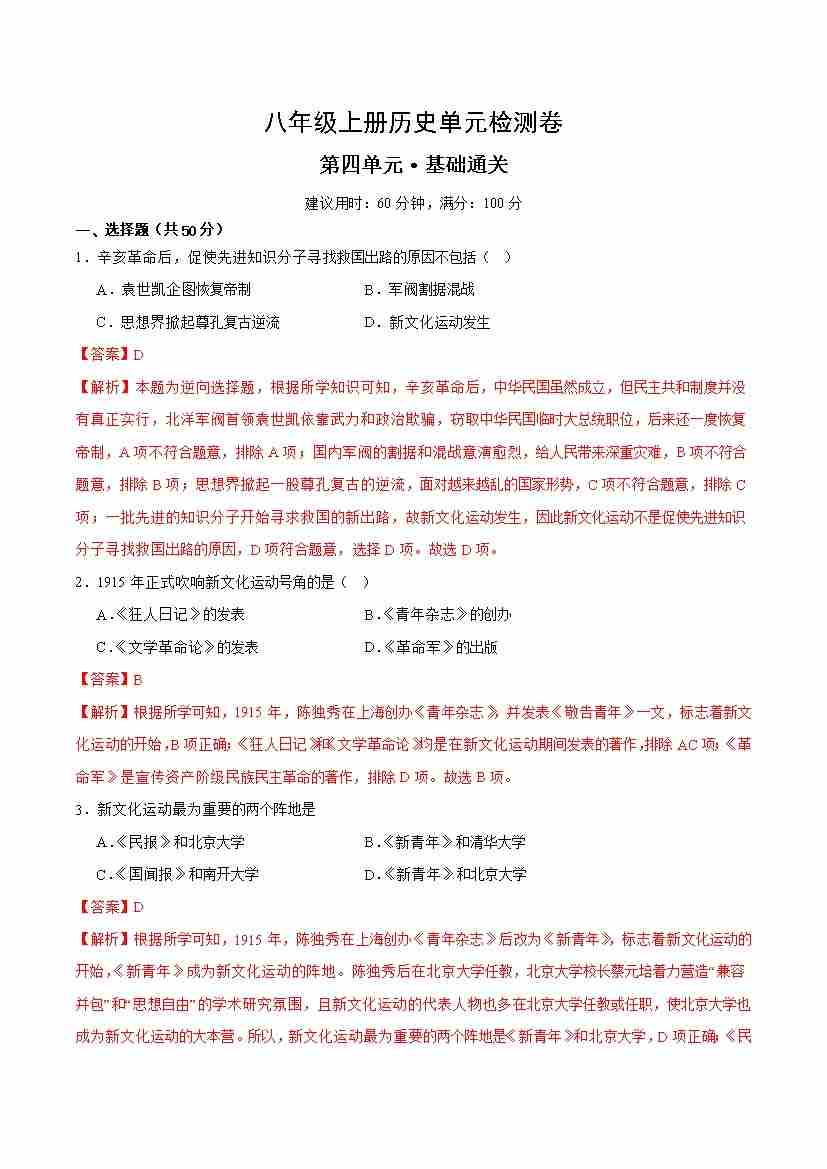 八上历史第四单元测试·基础卷(解析版)