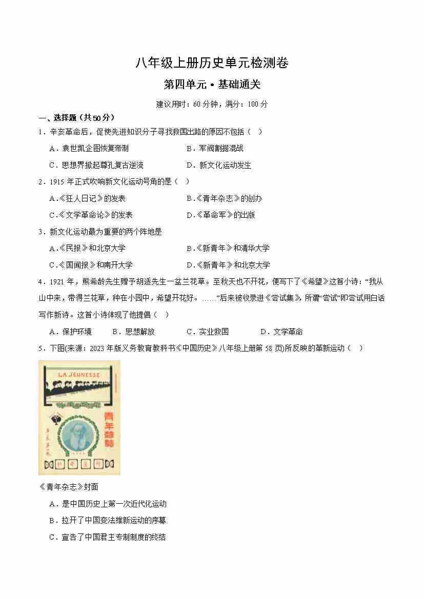 首页 > 全部 > 单元基础卷 > 八上历史第四单元测试·基础卷(考试版A4)