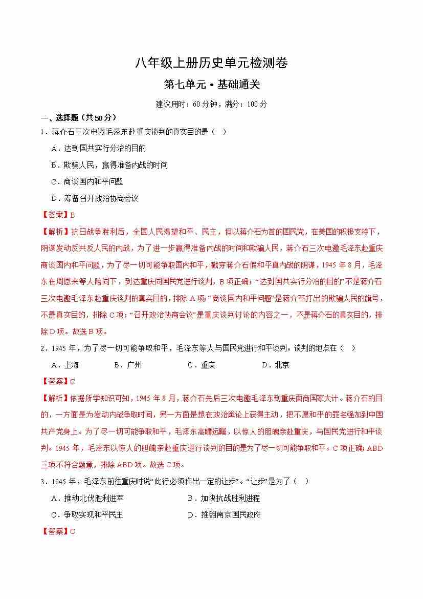 八上历史第七单元测试·基础卷(解析版)