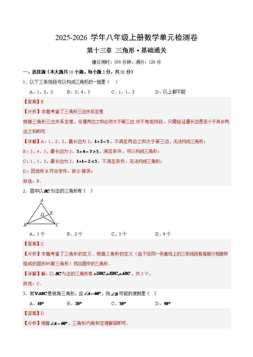 首页 > 全部 > 单元测试 > 八上数学第十三章 三角形·基础卷(解析版)