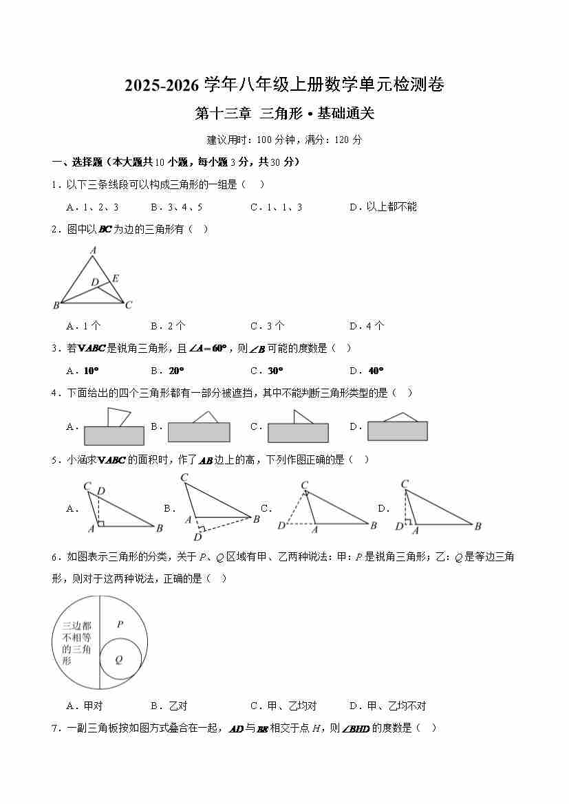 首页 > 全部 > 单元测试 > 八上数学第十三章 三角形·基础卷(考试版A4)