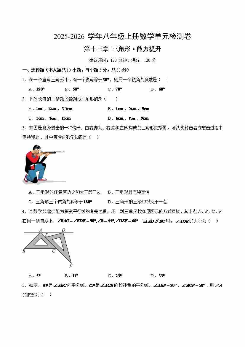 首页 > 全部 > 单元测试 > 八上数学第十三章 三角形测试·提升卷(考试版A4)