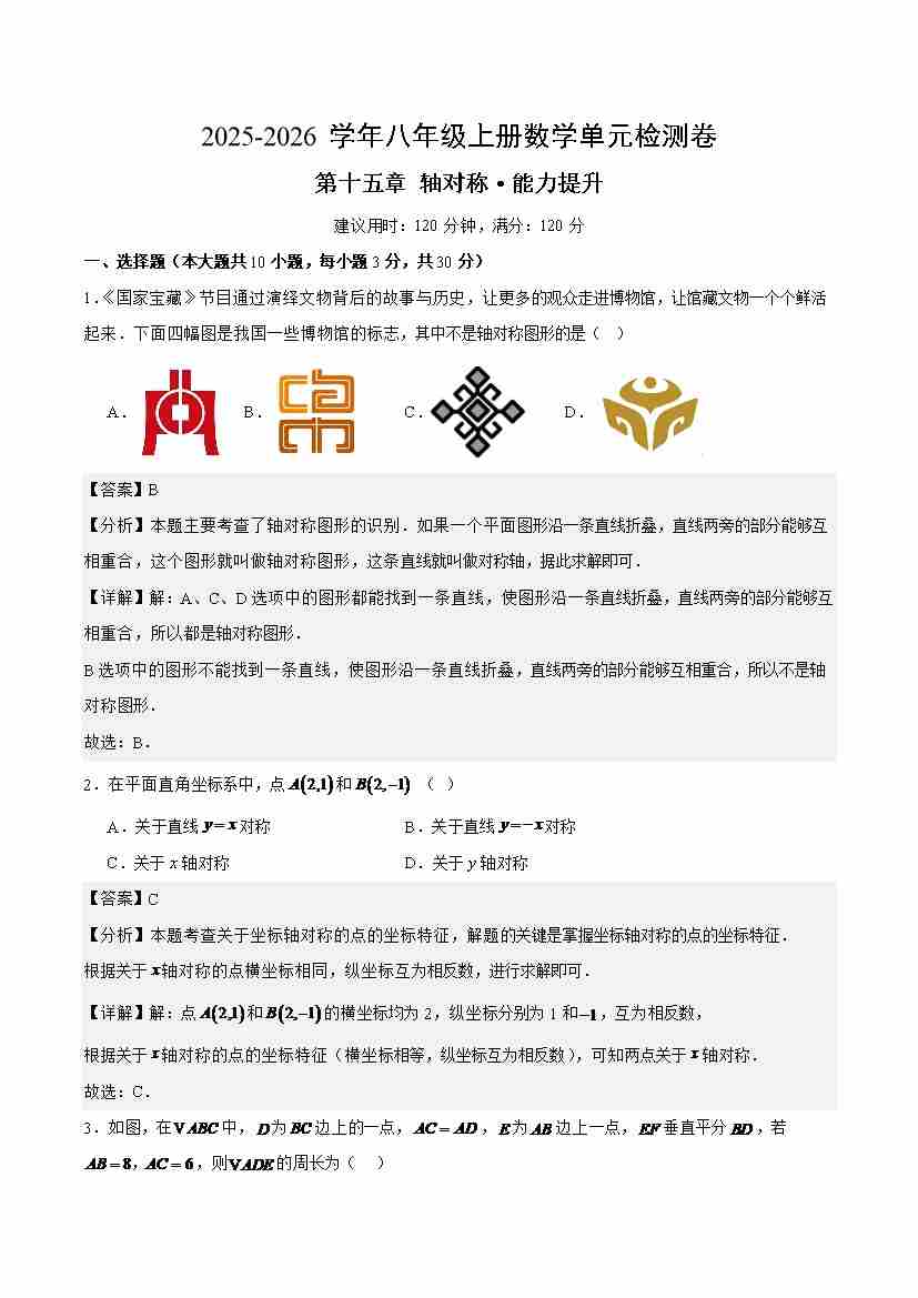 首页 > 全部 > 单元测试 > 八上数学第十五章 轴对称测试·提升卷(解析版)