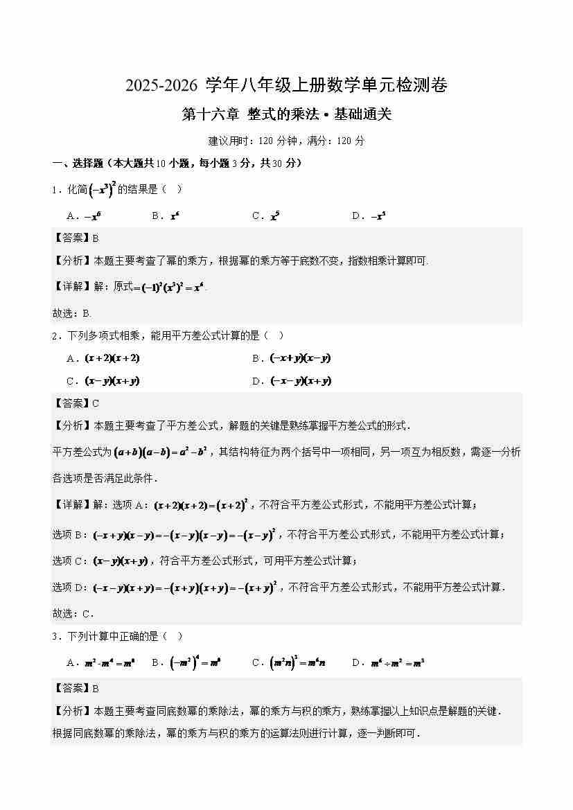 首页 > 全部 > 单元测试 > 八上数学第十六章 整式的乘法测试·基础卷(解析版)