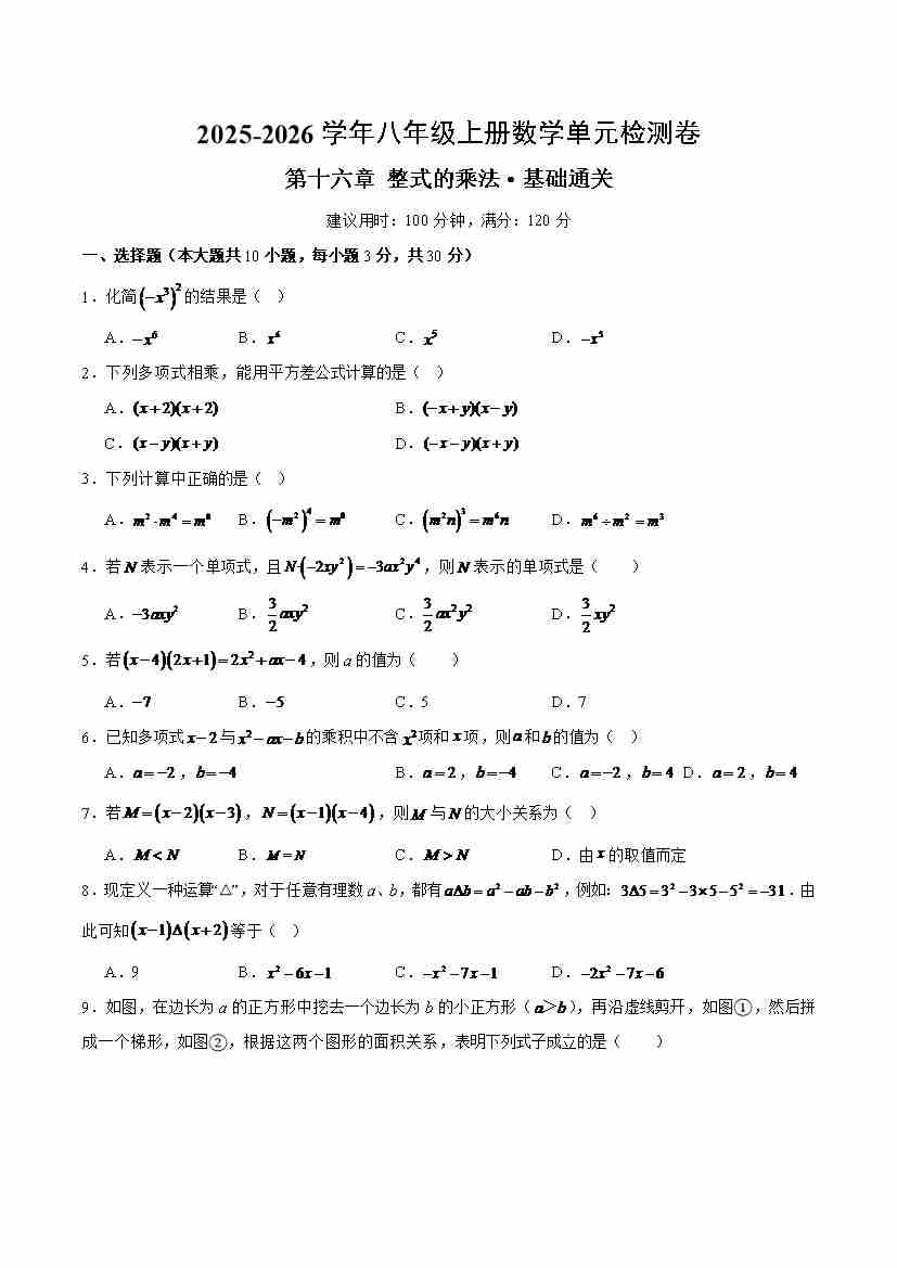 八上数学第十六章 整式的乘法测试·基础卷(考试版A4)