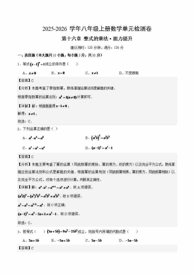 首页 > 全部 > 单元测试 > 八上数学第十六章 整式的乘法测试·提升卷(解析版)