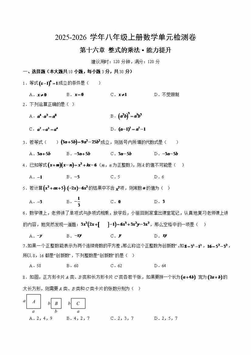 首页 > 全部 > 单元测试 > 八上数学第十六章 整式的乘法测试·提升卷(考试版A4)