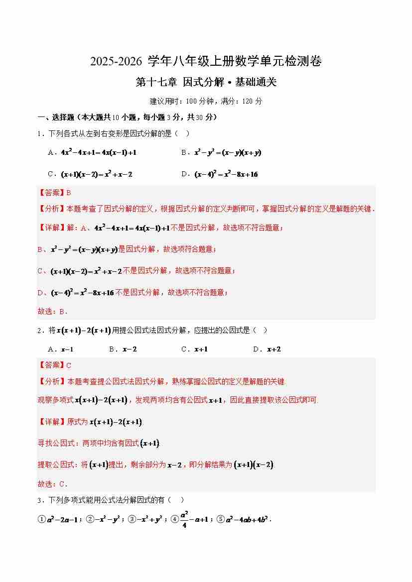 首页 > 全部 > 单元测试 > 八上数学第十七章 因式分解·基础卷(解析版)