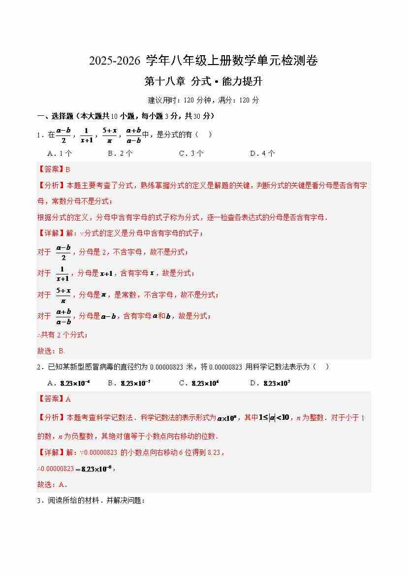 首页 > 全部 > 单元测试 > 八上数学第十八章 分式测试·提升卷(解析版)