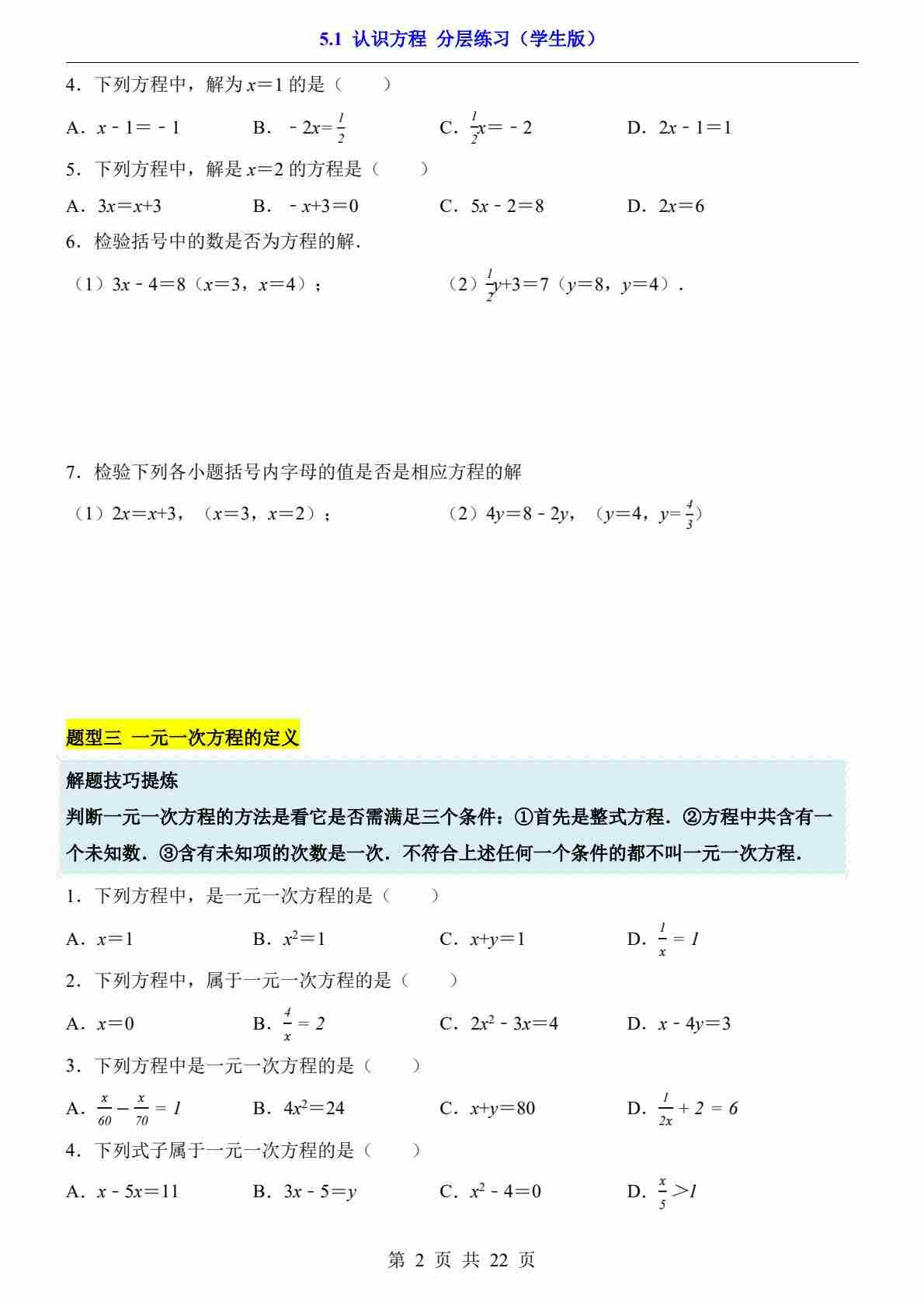 5.1 认识方程(分层练习)
