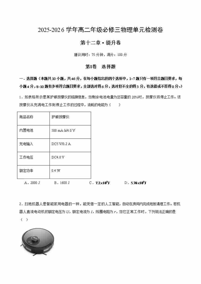第十二章 电能能量守恒定律(单元测试·提升卷)(考试版)