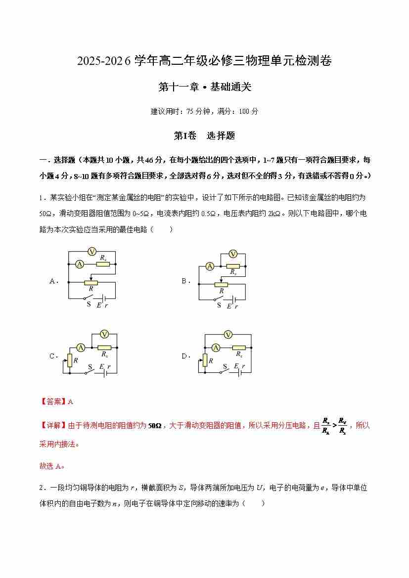 第十一章 电路及其应用(单元测试·基础卷)(教师版)
