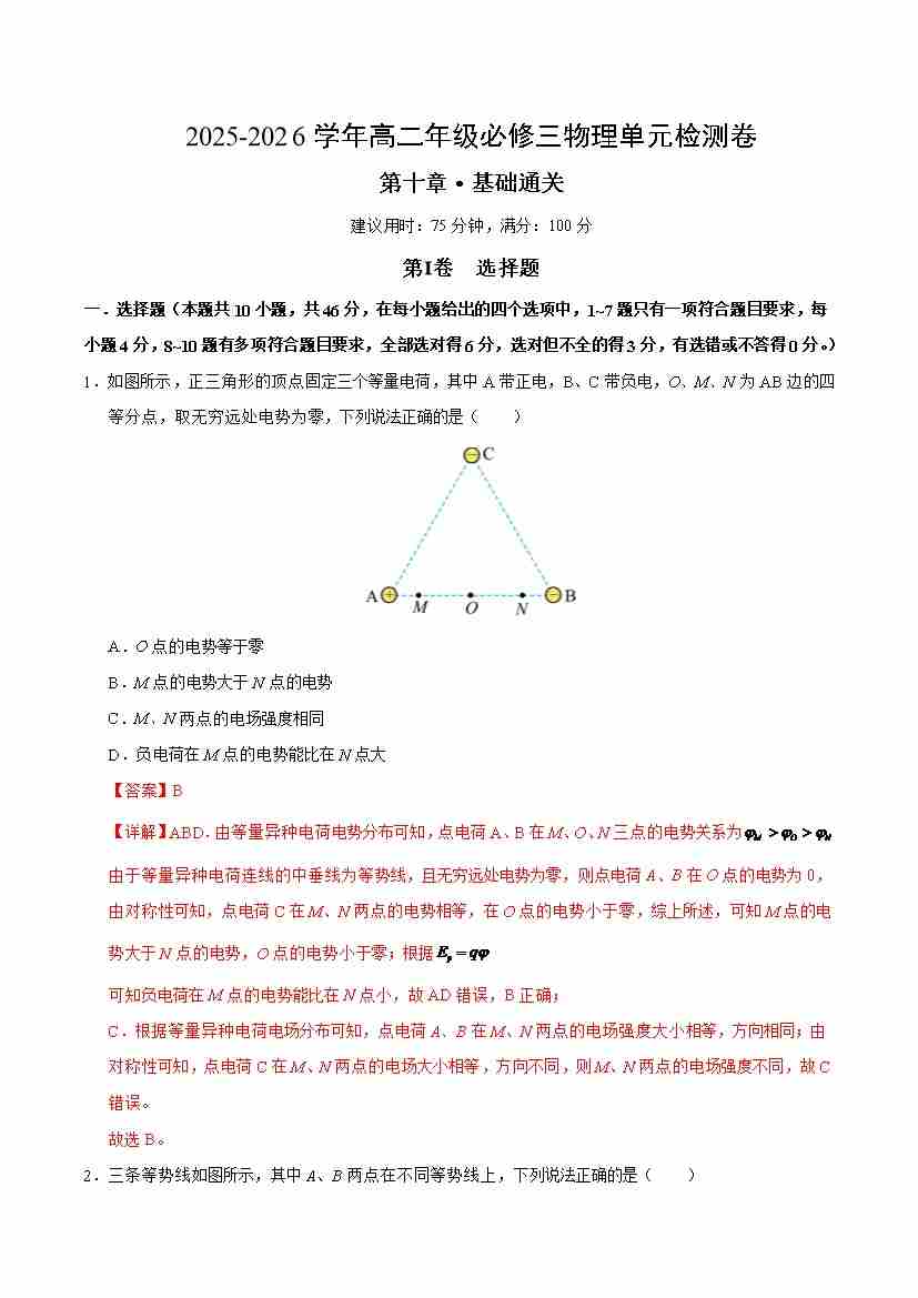 首页 > 全部 > 单元测试 > 第十章 静电场中的能量(单元测试·基础卷)(教师版)