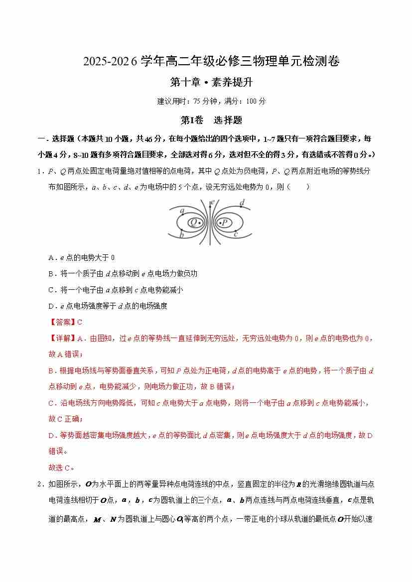 首页 > 全部 > 单元测试 > 第十章 静电场中的能量(单元测试·提升卷)(教师版)