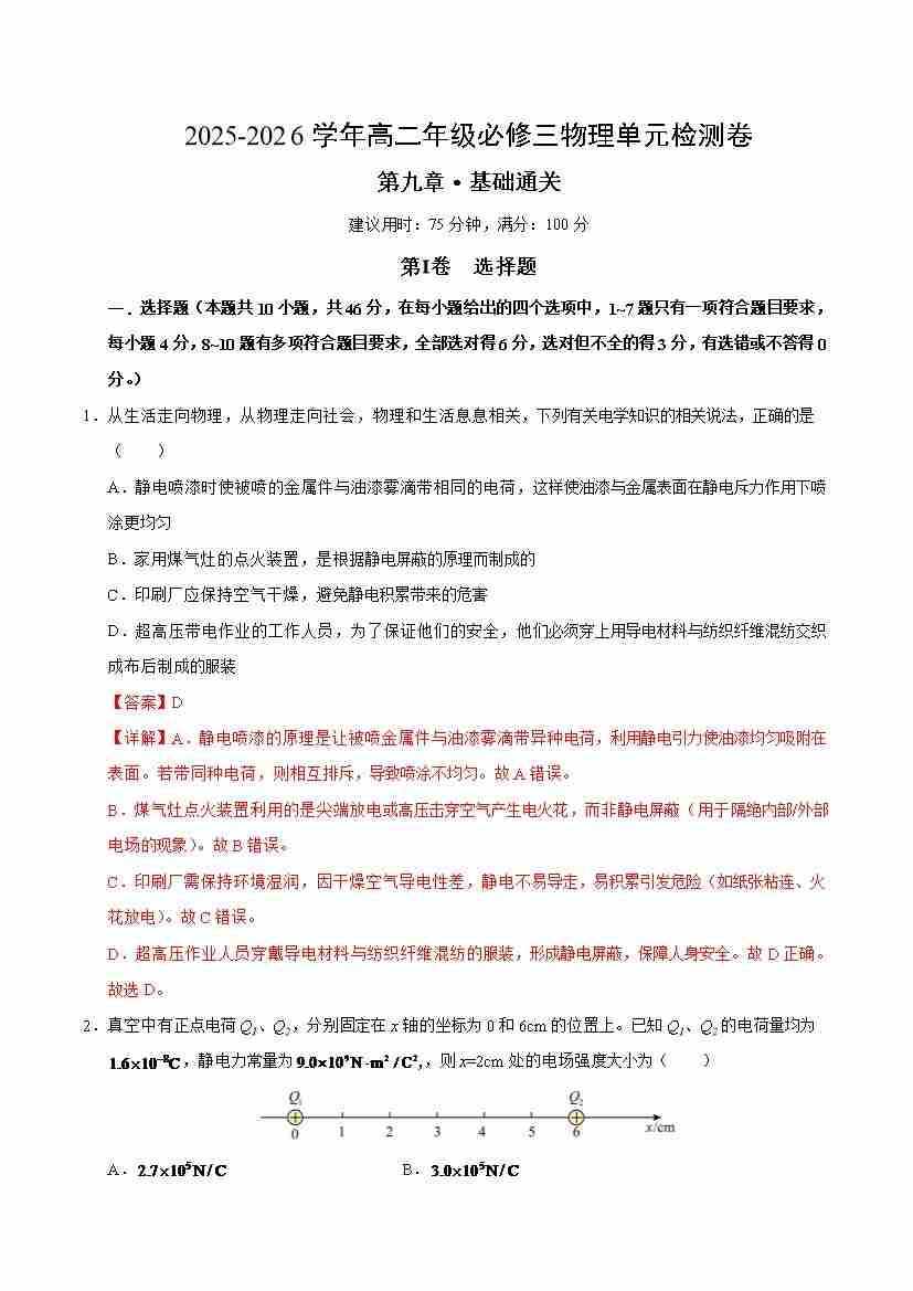 首页 > 全部 > 单元测试 > 第九章 静电场及其应用(单元测试·基础卷)(教师版)