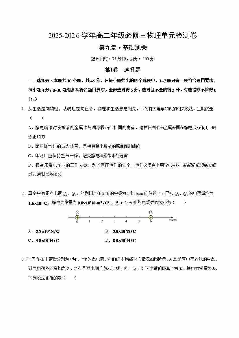 首页 > 全部 > 单元测试 > 第九章 静电场及其应用(单元测试·基础卷)(考试版A4)