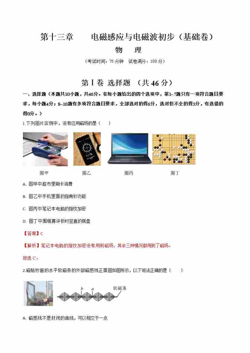 首页 > 全部 > 举一反三 > 第十三章 电磁感应与电磁波初步(举一反三单元测试·基础卷)(教师版)